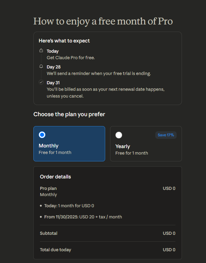 Buat kamu yang ingin mencoba Claude Pro tanpa perlu langsung bayar, saat ini Anthropic sedang membuka promo 1 bulan gratis khusus periode Oktober 2025.