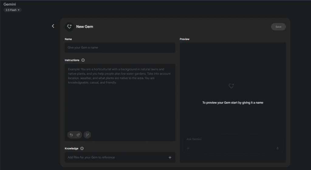 3. Berikan Nama dan Deskripsi: Berikan nama yang jelas untuk “Gem” Anda, misalnya “Pelatih Kebugaran” atau “Asisten Penulis Artikel SEO”. Tambahkan deskripsi singkat tentang peran dari “Gem” tersebut.